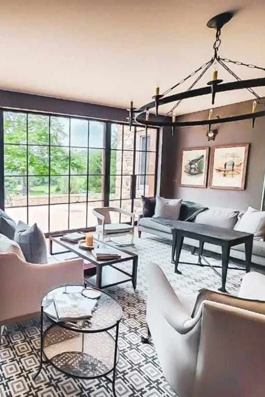 Set towards the front of the plot to maximize outdoor space behind, the property creates a bold first impression thanks to an oversized, arched bronze entrance door with sidelights and transoms making the most of the large opening and immediately inviting the gaze inside.