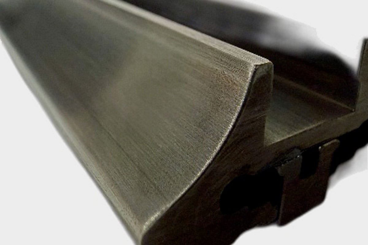 Our bronze architectural products are available in five patina finishes – from left: charcoal, chestnut, natural brushed, unbrushed (mill finish), and charcoal. This is a highly bespoke, handcrafted process that creates a living finish – so whilst we strive for optimal consistency, colors do vary, and the patina will continue to evolve over time.