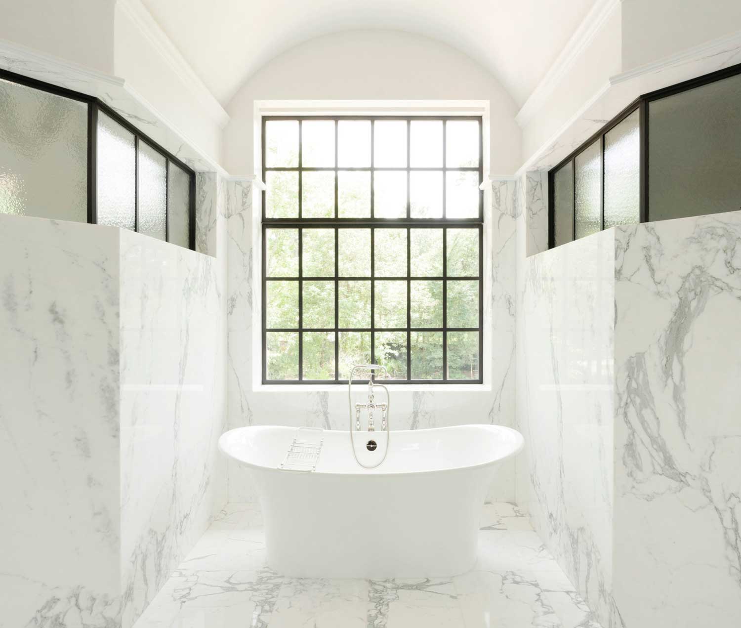 Opening off that jaw-dropping dressing room is the master ensuite, sitting in fairly stark contrast to the earthy, heritage feel of rest of the house and resplendent in crisp, cool marble. The ultimate his & hers oasis, it features twin showers completely enclosed behind solid walls, save for a series of toplights and an entrance door, mirrored on either side of a large steel casement window.