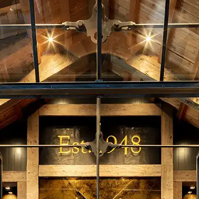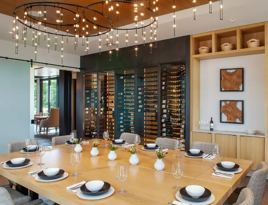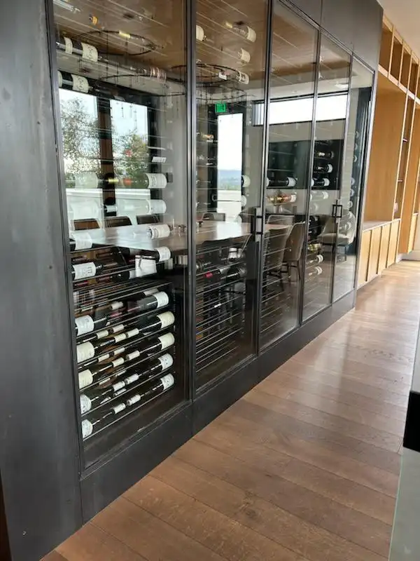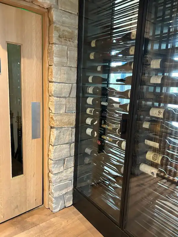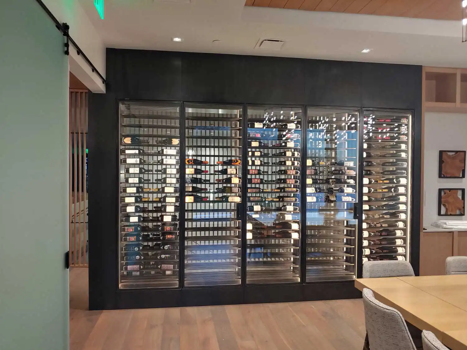 Inside, modernist crispness meets warmth and texture. At the heart of the space is the Summit Kitchen – a showcase restaurant featuring a custom statement wine cellar. Created using our Revival enclosure system, it’s finished in a charcoal patina, complete with reach-in locks for a refined presentation that unites architectural precision with luxury and craftsmanship.