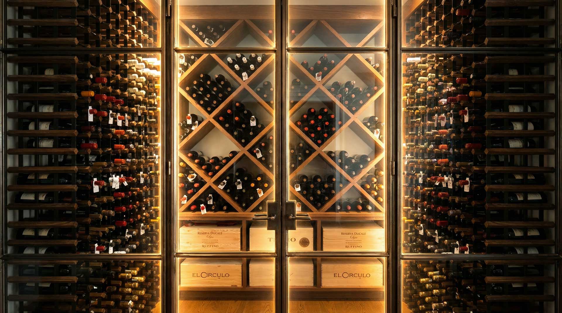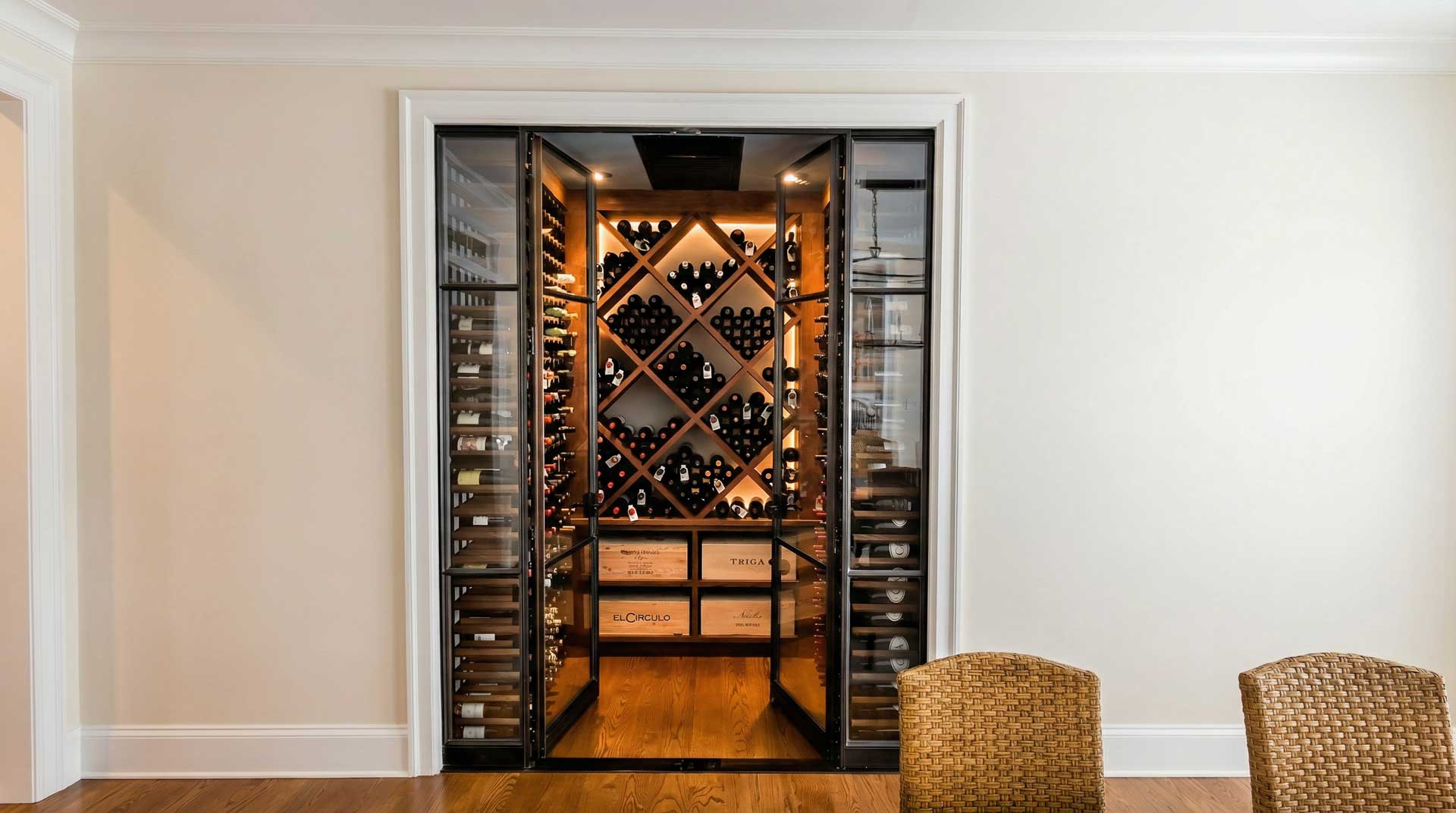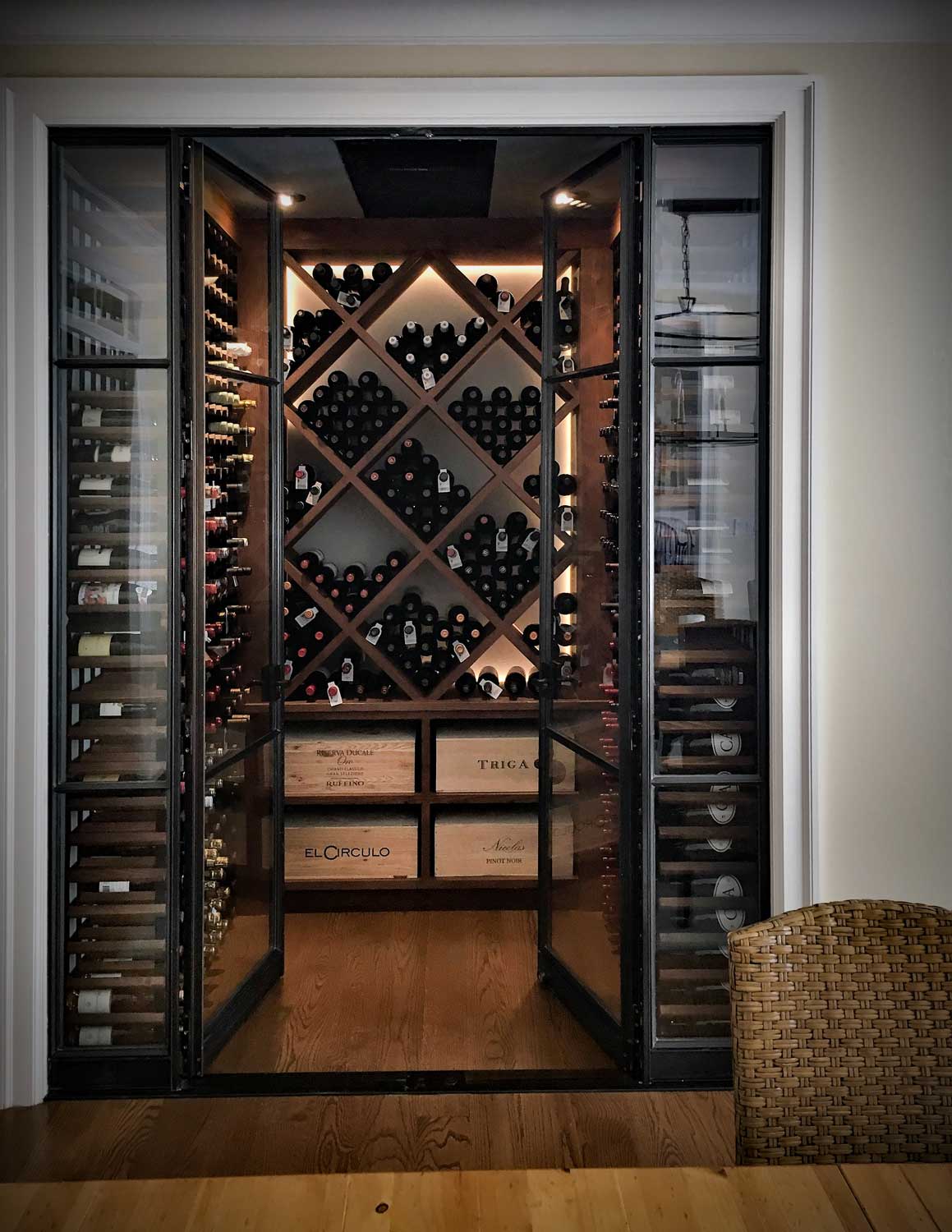 Installed at a luxury family home in Washington, DC, this compact wine cellar has been carefully recessed into the wall of the elegant formal dining space. A combination of individual bottle racks and traditional diamond wine storage sits behind solid bronze doors from our Nexus collection, finished in a classic charcoal patina and showcasing the owner’s extensive wine collection to perfection.